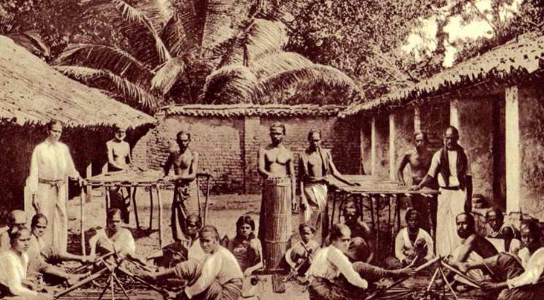 පිදුරු සෙවිලි කළ වහළකින් හා කටු මැටි ගැසූ ශාලාවකි |